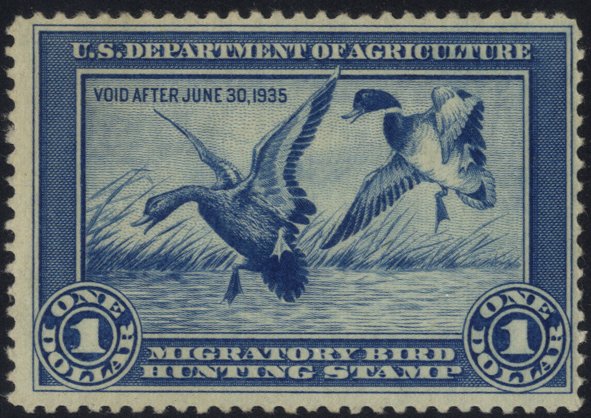 1934 Hunting permit 'Duck' stamp $1 blue UM centred to upper right, Scott RWI