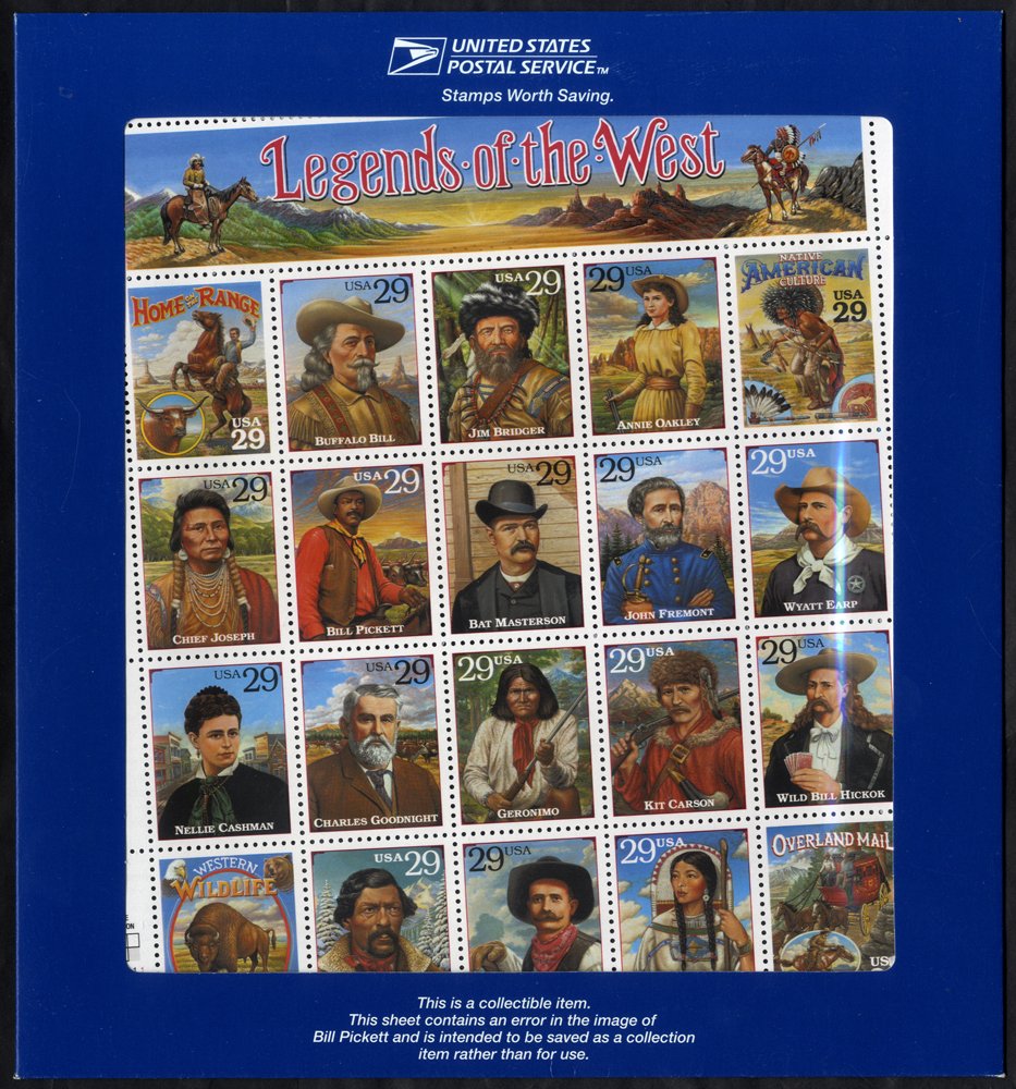 1994 legends of the west - error sheet of 20 x 29c, sheet containing incorrect image of Bill Pickett in souvenir pack, normal sheet accompanies both UM. SG. 2950 1st & 2nd printing.