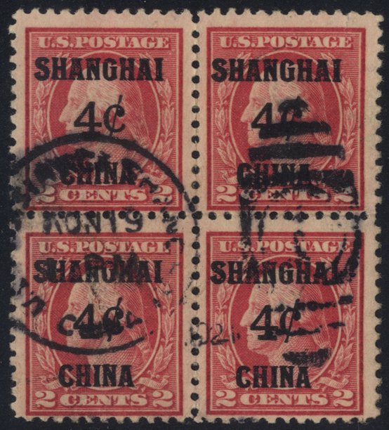 SHANGHAI - POSTAL AGENCY IN CHINA 1919 4c on 2c carmine block of four with duplex cancel, SG.2