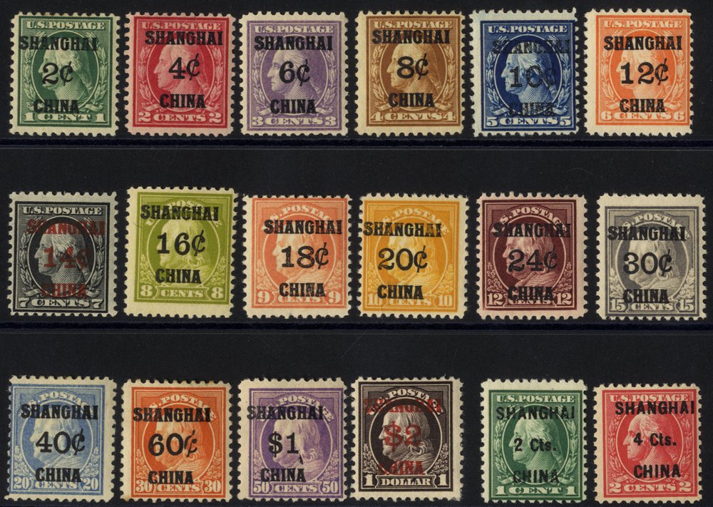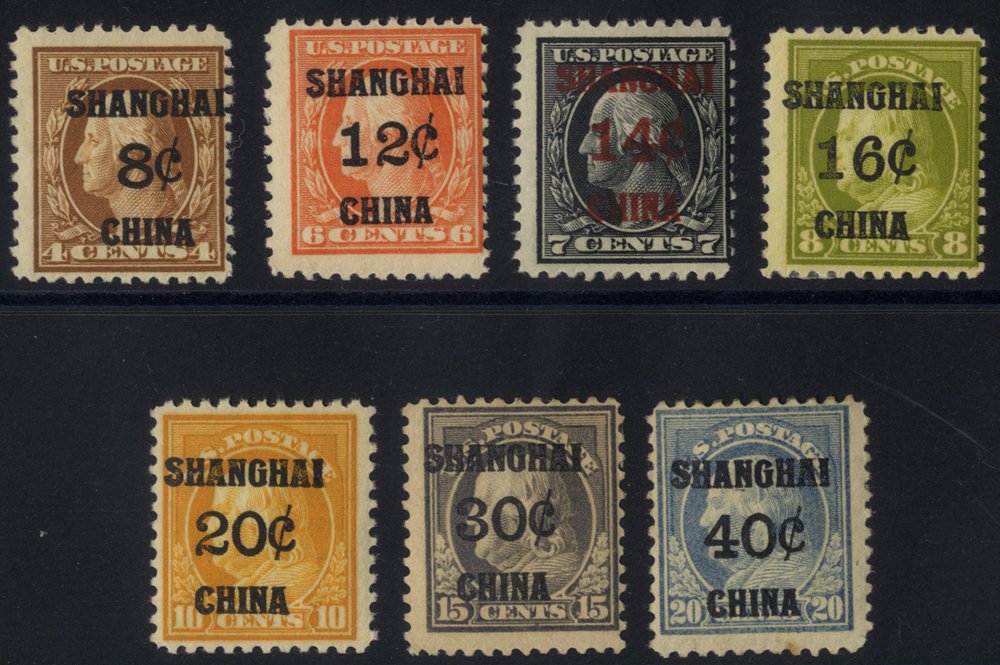 SHANGHAI - POSTAL AGENCY IN CHINA 1919 surcharge type 1. 8c, 12c, 14c, 16c, 20c, 30c & 40c large part o.g, odd gum crease, fresh appearance from SG4/13, Cat. £830