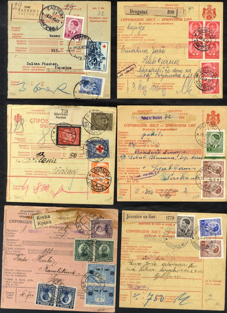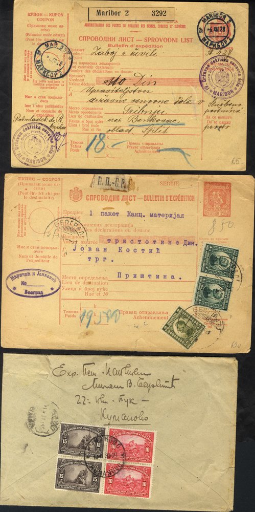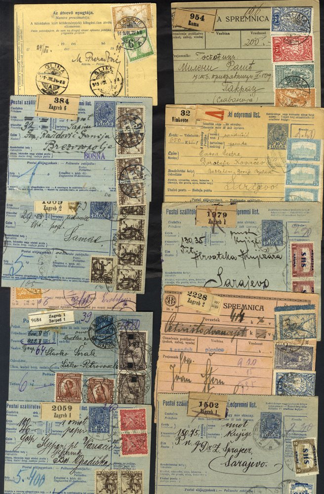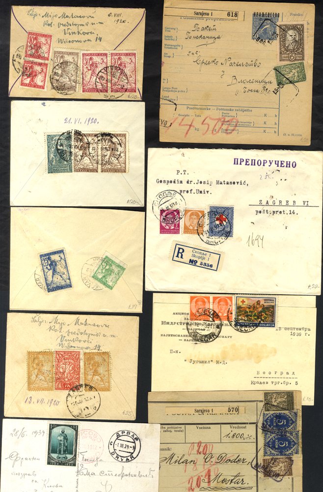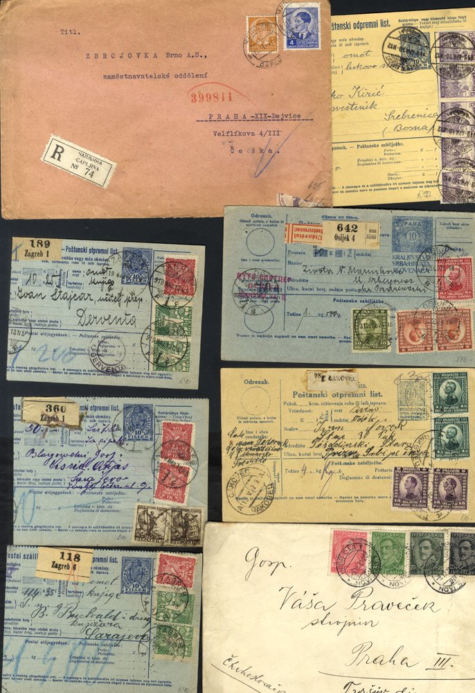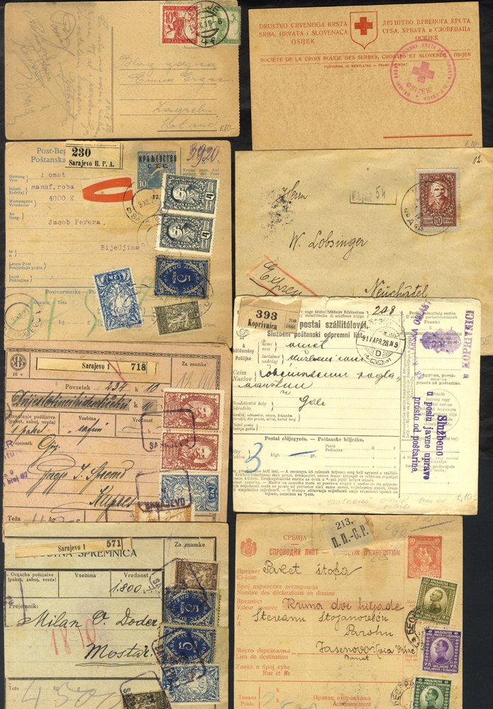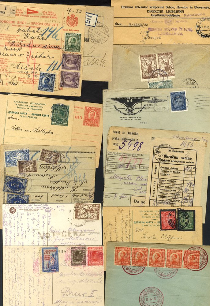 1902-50's selection of 10 covers or cards incl. registered at express and with items from Serbia & Croatia noted 1920 Dtakova - Reichenberg cover with multi 'Chainbreaker' frankings, then a selection of parcel cards (17) bearing a verity of multiple or mixed frankings, adhesives incl. 'S.H.H' overprints on Hungary, Chainbreakers, Sailors, Kings Peter & Alexander, a colourful assemblage. (27)