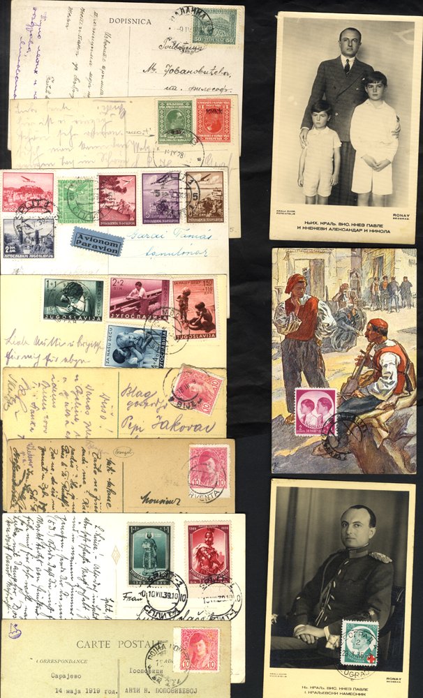 1919-39 selection of picture postcards, most used, one an express bearing various adhesives incl, 137 airs & 1939 Child Welfare set, Kosovo pair, mostly fine (18). then a selection of 50 para parcel cards with additional frankings, some mixed & incl. Red Cross stamps & labels. (35 items)