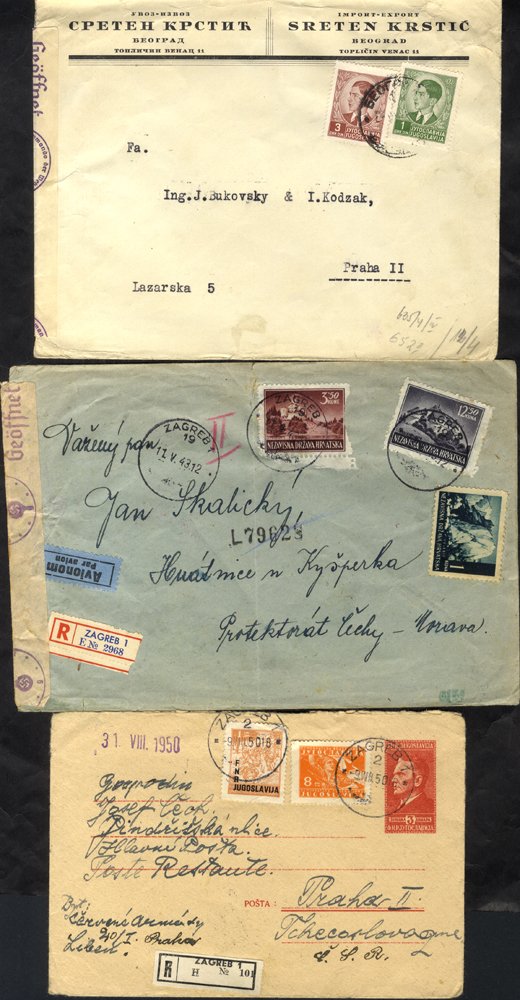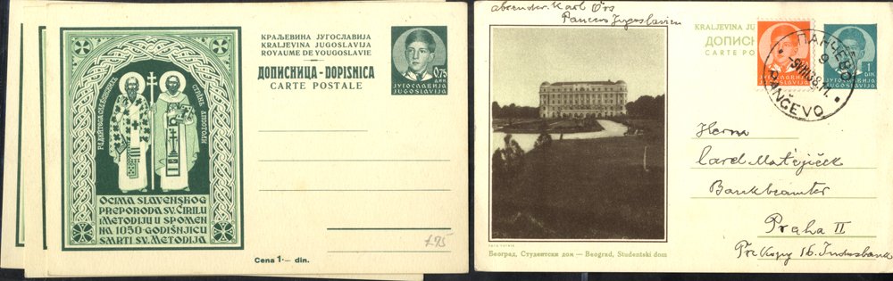 1921-50 selection of covers & cards bearing variety of frankings & cards, some airmails & censors, noted 1921 registered Hungarian 17 filler postal stationery envelope surcharged 'Kraljevstro/SHS/I Kruna' and franked on reverse 10p (2) Alexander cancelled Nagybegskerek and addressed to Panceva, also 1933 75p postal stationery card uprated 75p + D1.50 used on Zemun commemorative flight addressed to Erfurt Germany, the obverse bears red 2 line cachet of Nurnberg Airport transit, finally 1936 Saints Cyril and Methodists anniv set of 3 illustrated postal stationery cards, fresh unused. (17)