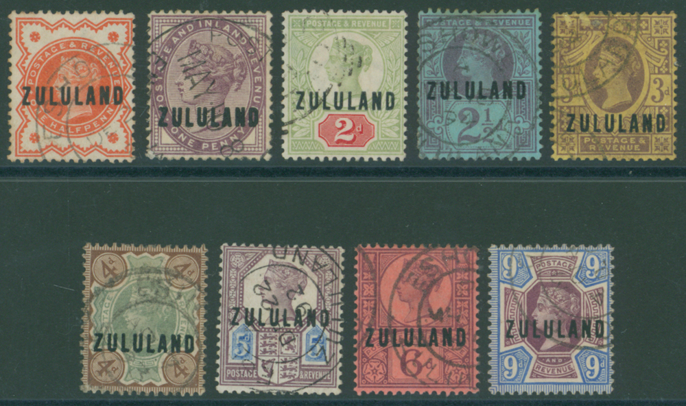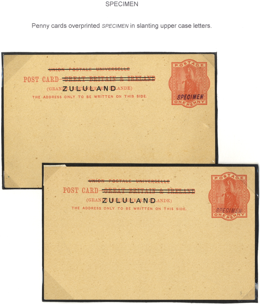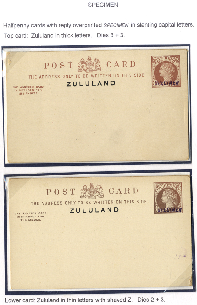 1893 GB overprinted reply paid cards (2 different) both h/stamped 'SPECIMEN'. One card has 'ZULULAND' in thicker letters, the other thin letters & with shaved 'Z'. An interesting comparison.
