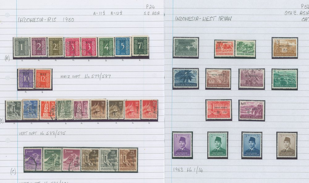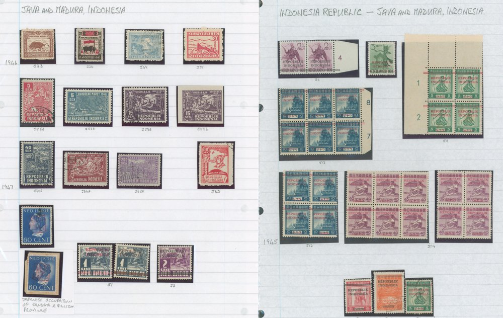 1945-78 M & U collection incl. 1945 Japanese Occupation 3½c (SG.J10), 1946 commems, 1946-47 range of defins, some Sumatra issues, United States; Republic commems & defins, RIS Ovpts with 1r to 25r U (Cat. £350+) & M (Cat. £1070+) not certified, some later defins, also some West Irian etc, fair to fine. (367)