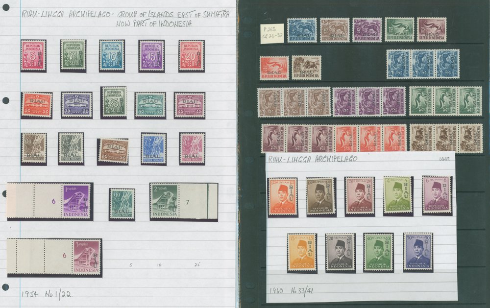 Riau-Lingga Archipelago: 1954-60 UM or M range incl. 1954 to 25s T1 (Cat. £350), T2 to 90s (Cat. £700), 1r to 3r, 1958-64 set + set in vertical strips of three, 1960 set, mainly fine. Ovpts not certified. Sold 'as is.' (56)